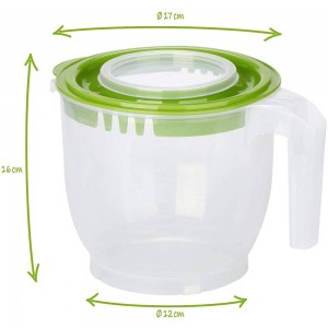 پارێزەرى خۆراک سەلامەتە بۆ قاپشۆڕ تا +95 پلەی سەدی بەستن تا زۆرترین. -25 پلەی سەدی قەبارەی پڕکردنەوە: 2.2 لیتر لاستیک دژە خلیسکان دەسکێکی گەورە بۆ گرتنی توند لەکاتی تێکەڵکردندا کەرەستە: پلاستیک پاسەوانی سپڵاش و قاپەکە ڕەنگ: شەفاف/سەوز قەبارەکانی (Ø * H): 160 * 150 ملم..