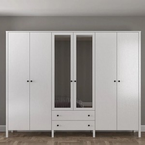 دولابی جل و بەرگی سپی فراوان کە 6 دەرگای تێدایە، لەنێویاندا 2 دەرگای ئاوێنە، و 2 چەکمەجەی گونجاو. بە ڕەهەندەکانی 240*190*54 سم، شوێنی هەڵگرتنی بەرفراوان پێشکەش دەکات و ڕەنگێکی ستایل زیاد دەکات بۆ هەر ژوورێکی نووستن...