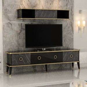 ئەم ستاندە تەلەفزیۆنییە دیزاینێکی شیکی ڕەنگدەداتەوە بە دیمەنە مەڕمەڕییە ڕەشەکەی و وردەکارییە زێڕینەکانی. شوێنی هەڵگرتنی فراوان پێشکەش دەکات کە شوێنی زیاتر بۆ شتە دیکۆراتییەکان و کتێبەکانتان دابین دەکات. یەکەی تەلەفزیۆنەکە چەندین ڕەفە و ژووری تێدایە. لە چیپبۆردێکی ڕووخساری میلامین دروستکراوە تەواو بووە بە ڕەنگی ڕەش میلامین قاچێکی پلاستیکی شێوەی گ..